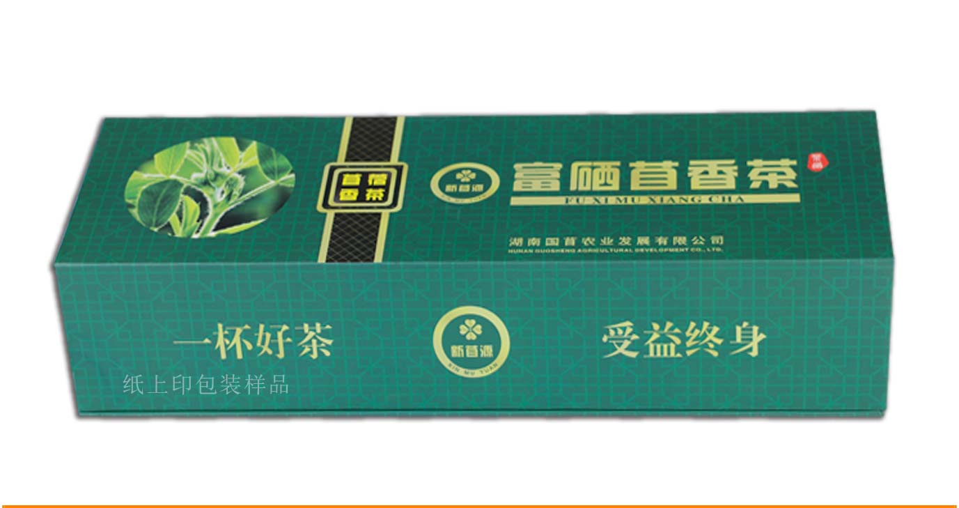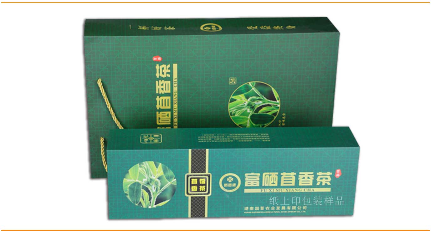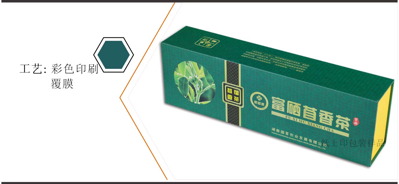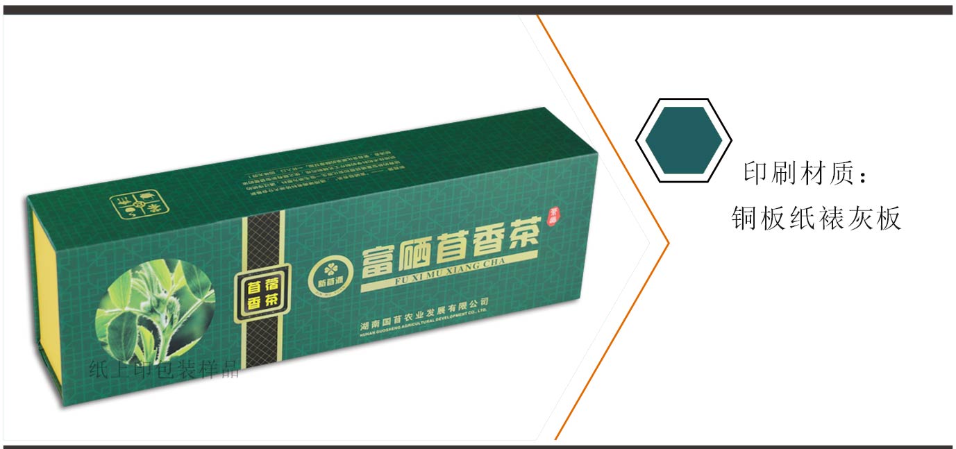 【使用范围】:湖南富硒苜香茶礼盒包装是一款书型盒,选用铜版纸裱灰板制作而成,配上同款手提袋更方便提携送礼,此款印刷材质也常用于特产包装盒、蜂蜜包装盒、化妆品包装盒、茶油包装盒等。