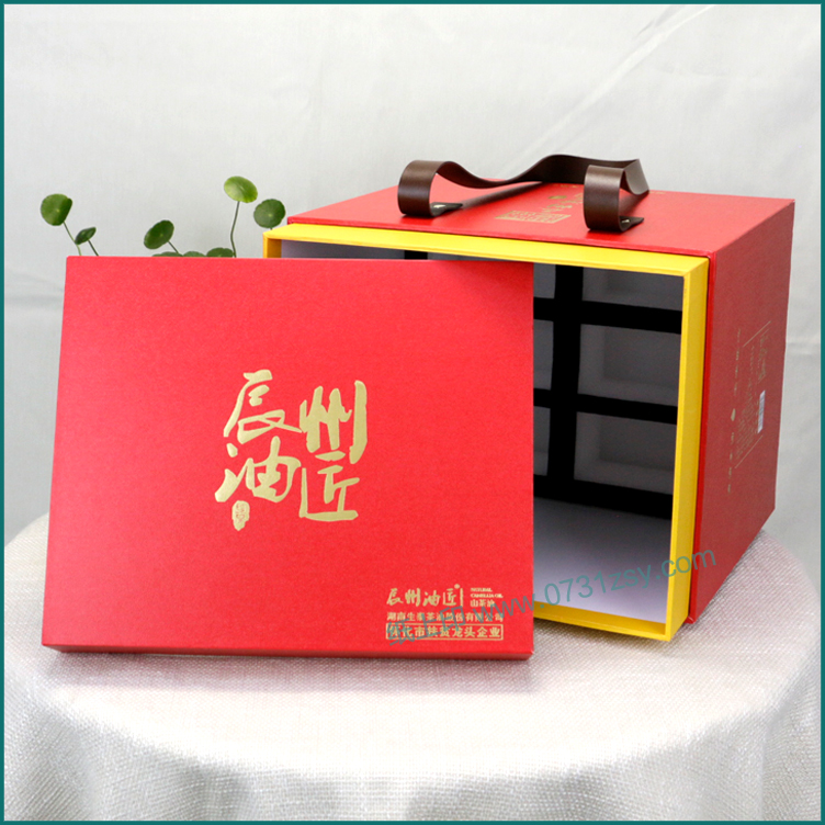 湖南生泰茶油股份有限公司通过网上搜索找到长沙包装厂家毅丰包装,通过前期的包装策划、打样修改,最终生产出大货,这款高档茶油礼盒包装精选特种纸裱灰板的材质,天地盖盒型配质感皮带提手,表面烫黄金工艺衬托出包装盒的精美大气,内衬材质是珍珠棉,可稳固六罐茶油的放置,整体盒型不仅美观且稳重受到客户的一致夸赞!