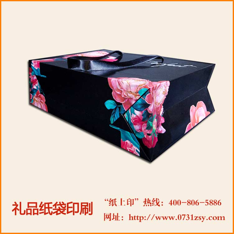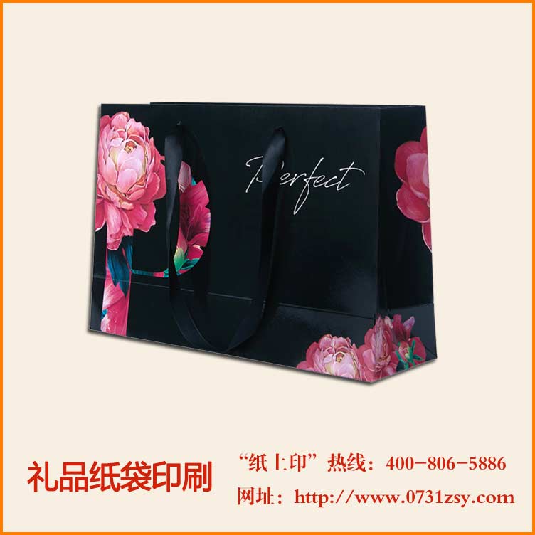 此款手提袋设计印刷采用白卡纸印刷,手提袋设计采用黑色的背景色,并采用几朵花来衬托手提袋,手提袋设计简洁明了,让人一目了然,长沙白卡纸手提袋印刷毅丰印刷厂是一家集手提袋设计,打样,印刷制作为一体的大型印刷厂家