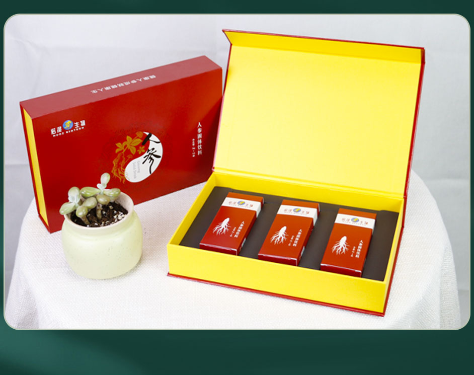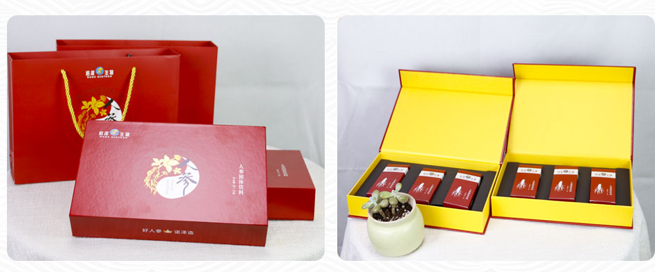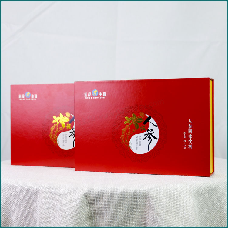湖南诺泽生物科技有限公司长期专注于健康植物提取物的研究、生产和销售,为国内外食品、饮料及日化产品生产厂家提供高品质的天然原料。全方位解决植物提取物中农药残留、塑化剂残留、重金属残留等有害物质,为价值链的相关利益方创造更高的价值,为提供健康的植物提取物系列产品。这款人参固体饮料包装盒盒型为书型盒,材质精选铜版纸裱灰板,内衬选用纸托配上三个卡盒,广泛适用于医疗保健品包装盒,茶叶包装盒,茶油包装盒,化妆品包装盒等,设计制作由长沙包装厂毅丰出品,设计运用到正红色,中间的人参图案略带传统的八卦图形,人参的烫金更显高档,简洁大方的包装设计得到诺泽生物科技有限公司的一致认可.
