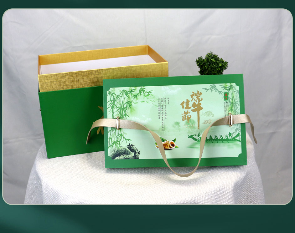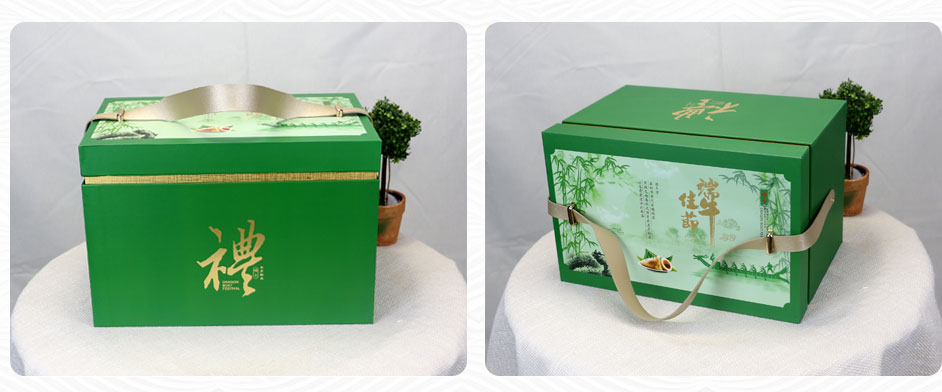 此款粽子礼盒出自长沙包装厂毅丰包装,精选铜版纸裱灰板的材质,天地盖的盒型配PU皮纹带提手,简约更方便提携,粽子礼盒表面做烫金、UV的工艺使礼盒更显精致,此款粽子包装盒材质广泛适用于食品礼品盒,茶油礼品盒,大米礼品盒,酒类礼品盒,月饼包装礼盒等,咨询热线:177-6366-7656